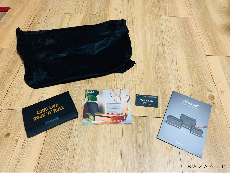 구성품은 저렇게 워런티카드, 그리고 제품을 둘러싸고 있는 천쪼가리(?), 그리고 각종 마샬을 대표하는 스피커 종류를 담